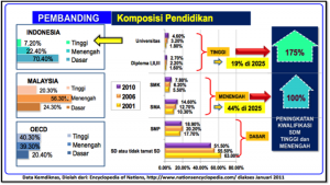 Data komposisi pendidikan di atas menunjukkan, hanya 7,2% dari populasi Indonesia yang menikmati pendidikan tinggi. Sementara Malaysia sudah 20,3%, dan rata-rata negara-negara OECD sudah mencapai 40,3%. “Dengan fakta ini pemerintah Indonesia harus bekerja ekstra keras untuk mencapai, setidaknya 20% warga negaranya yang berpendidikan tinggi. Bila itu dapat dikejar, dengan sendirinya akan berdampak pada pembangunan ekonomi secara keseluruhan. Namun bila tidak, yang terjadi justru bencana demografi”, tambah Zaenal.
